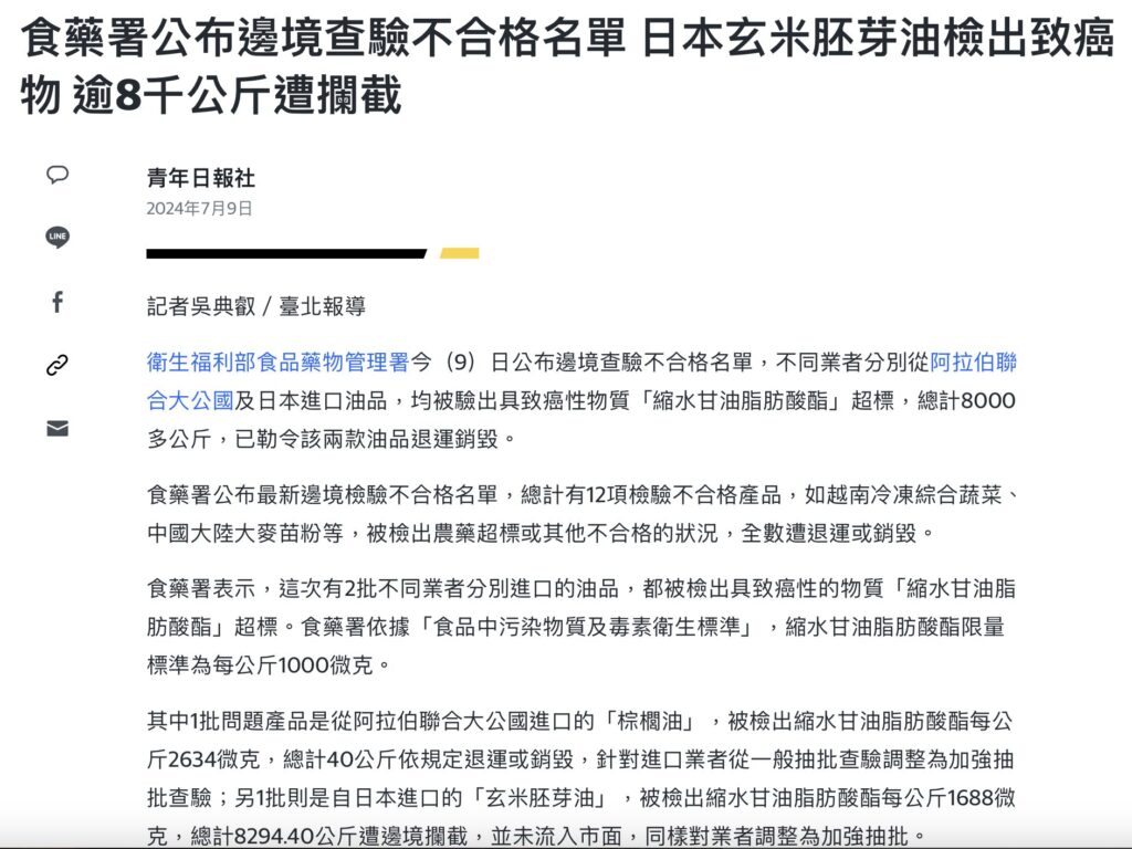 台湾食品薬物署が日本の玄米胚芽油から発がん物質検出、8トンを差し押さえと報道