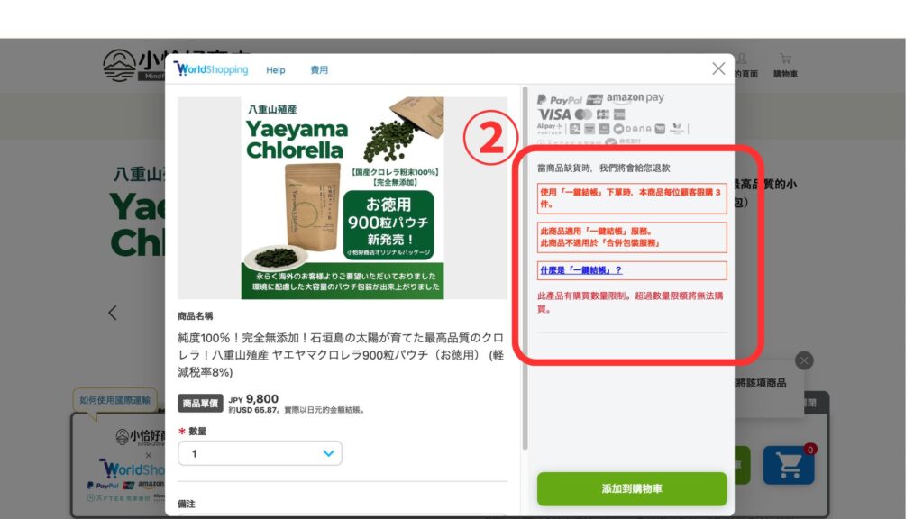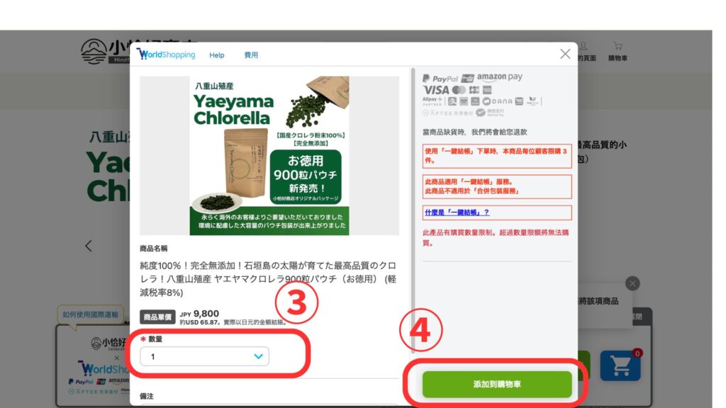 ③数量を確認して、④「添加到購物車(カートに入れる)」をクリック
