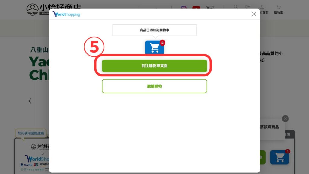 商品がカートに追加されると、確認画面が表示されます。「前往購物車頁面」(カートページへ)」をクリックして進みます。