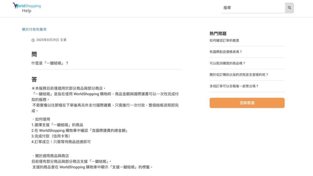 ワールドショッピングのヘルプページにあるワンクリック決済とは?という説明が書かれているページに飛びますので、ご確認ください。