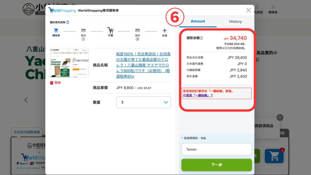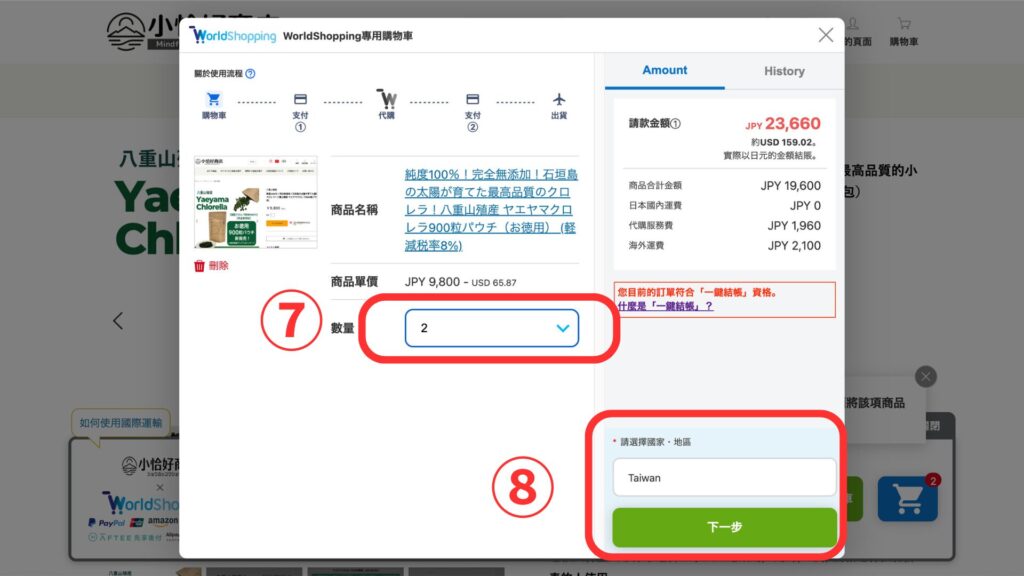 ⑧ の送付先国「Taiwan」を確認し、(違う場合はここで選択)「下一步(次へ)」をクリックします。