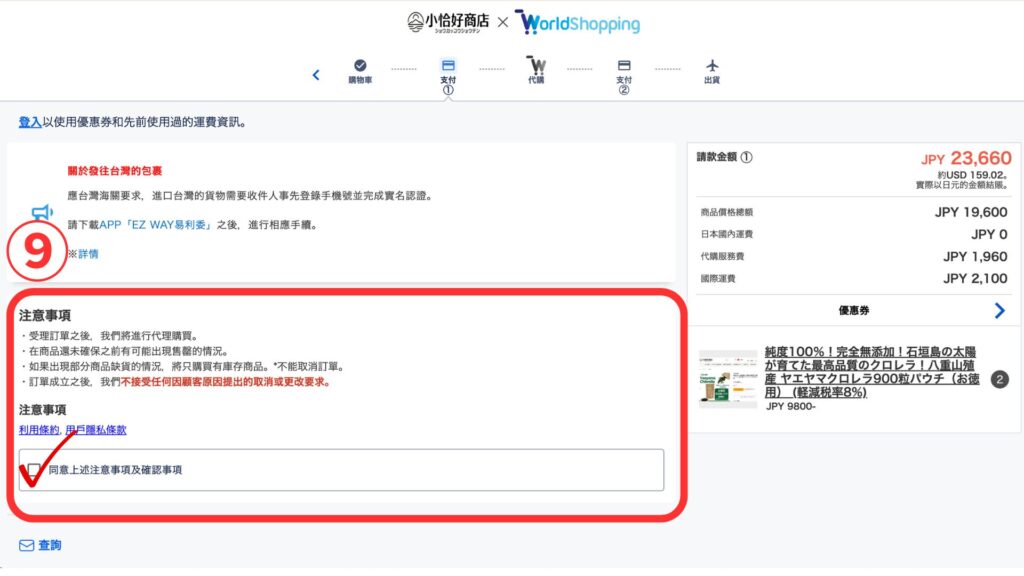ちなみに画像は台湾の場合です。関於臺灣海關的注意事項(台湾の税関に関する重要な情報)がまず上に表示されます。(これは台湾の皆様の方がよく知っていらっしゃると思います。)さらにその下に注意事項がありますのでよく読んで確認し、チェックボックスにチェック✅を入れます。