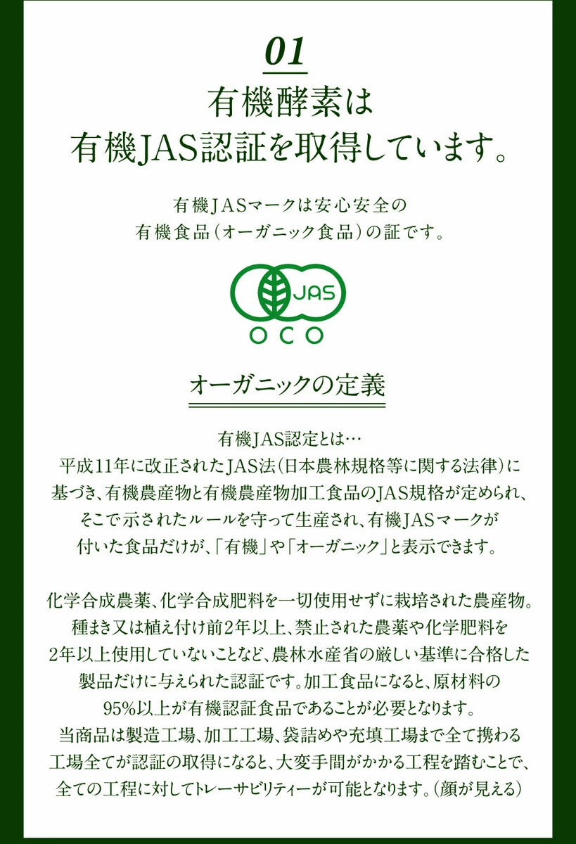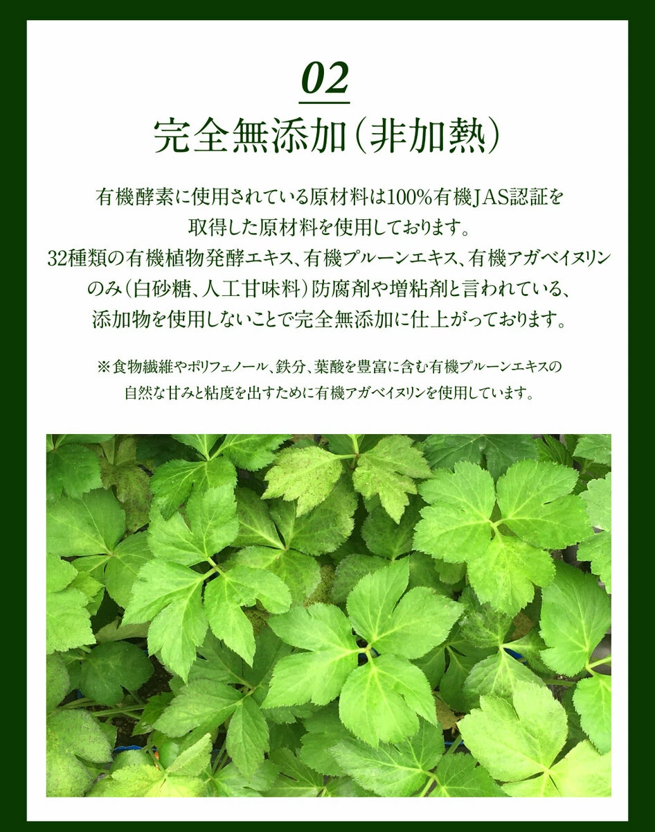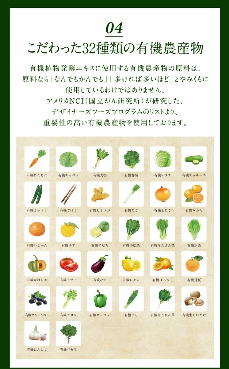 原材料は32種類の国産有機野菜と国産有機果物で構成されており、栽培過程では化学合成農薬や化学肥料を一切使用していません。