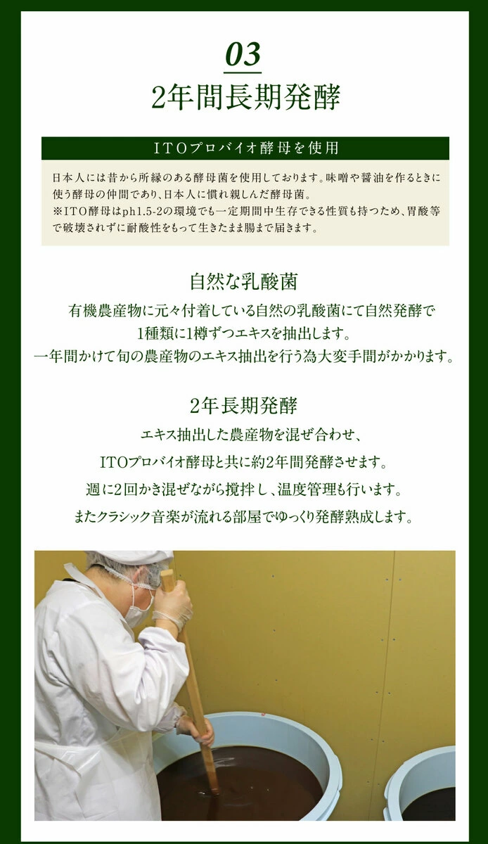 これらの野菜や果物は皮や種ごと約2年間発酵熟成され、味噌や醤油の製造に使用される強酸性に耐えるITOプロバイオティクス酵母で発酵されています。