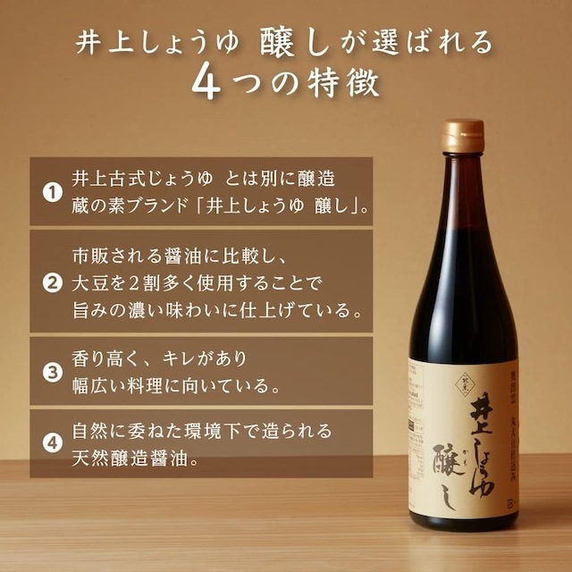 江戸時代から続く木樽で2年間醸された井上醤油店の中でもプレミアムな濃口醤油。