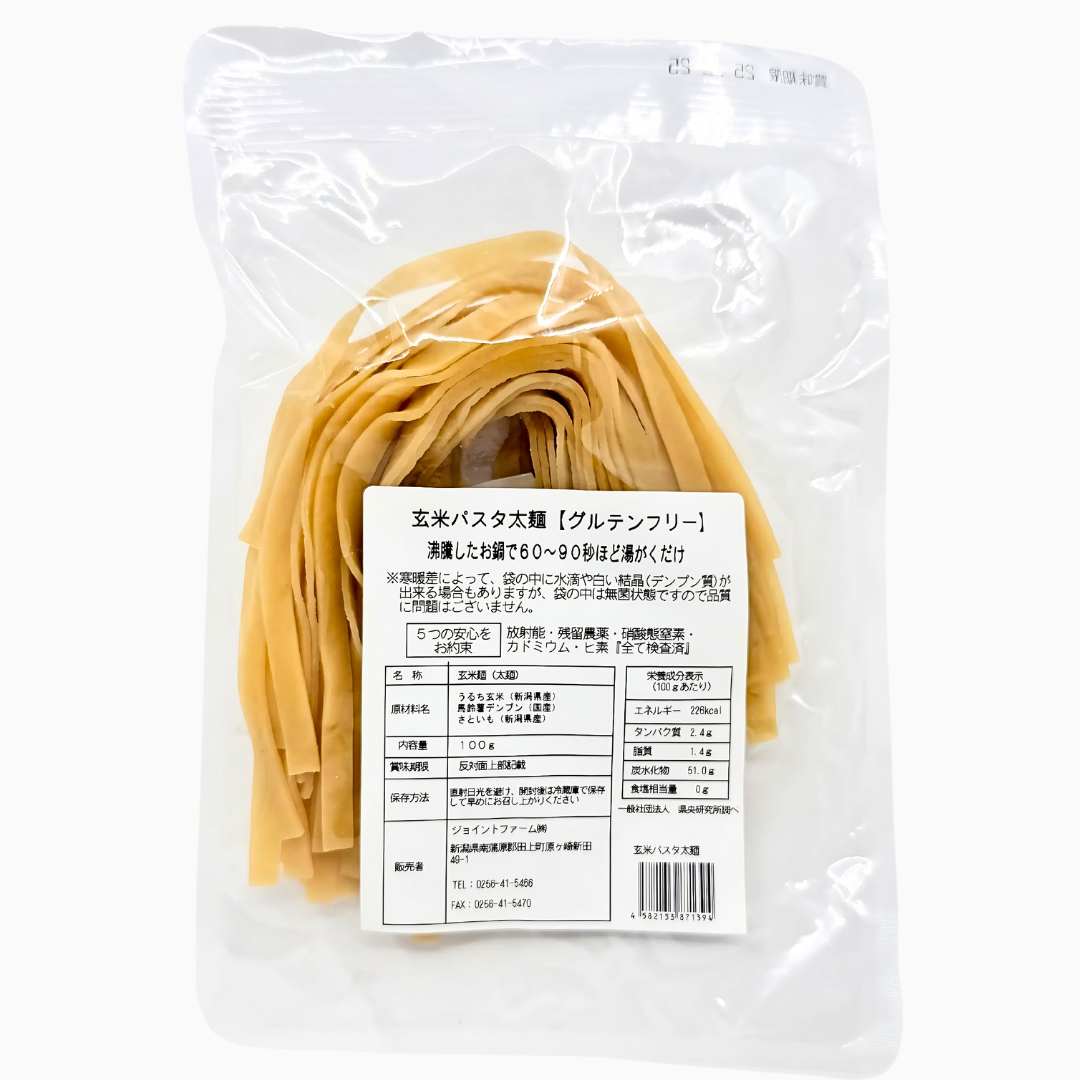 新潟県の有機農家「ジョイントファーム」が、自社栽培の特別な玄米「源泉米」で作ったグルテンフリーのヘルシー麺です。