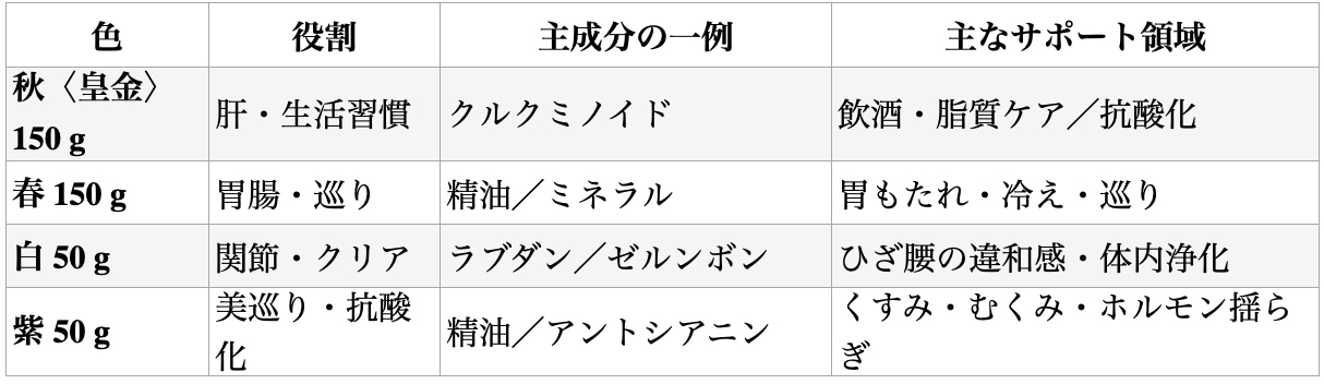 秋〈皇金〉は肝機能と脂質バランス、春ウコンは胃腸・巡り・冷え、白ウコンは関節の潤滑・体内クリア、紫ウコンは抗酸化・美容巡り・ホルモン調整——単品では一点集中になりがちなところを、ブレンドなら六面守備で支えられます。