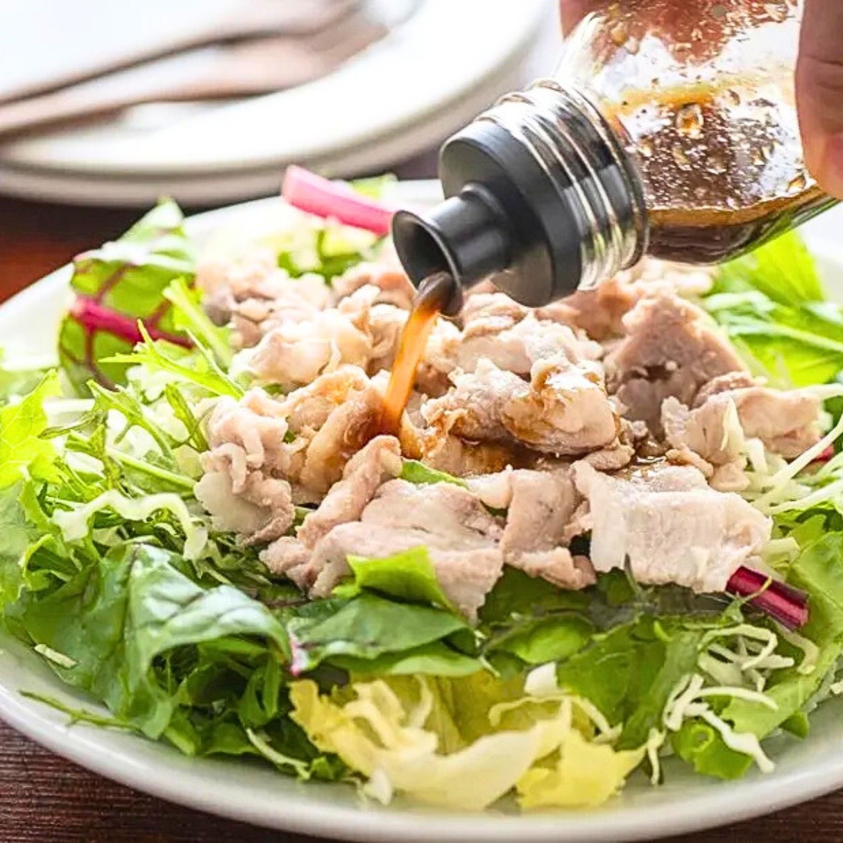 「梅酢ドレッシング」は、白梅酢・しょうゆ・オリーブオイルを各大さじ1ずつ混ぜ合わせるだけで完成します。サラダやカルパッチョ、冷しゃぶパスタにもよく合います。